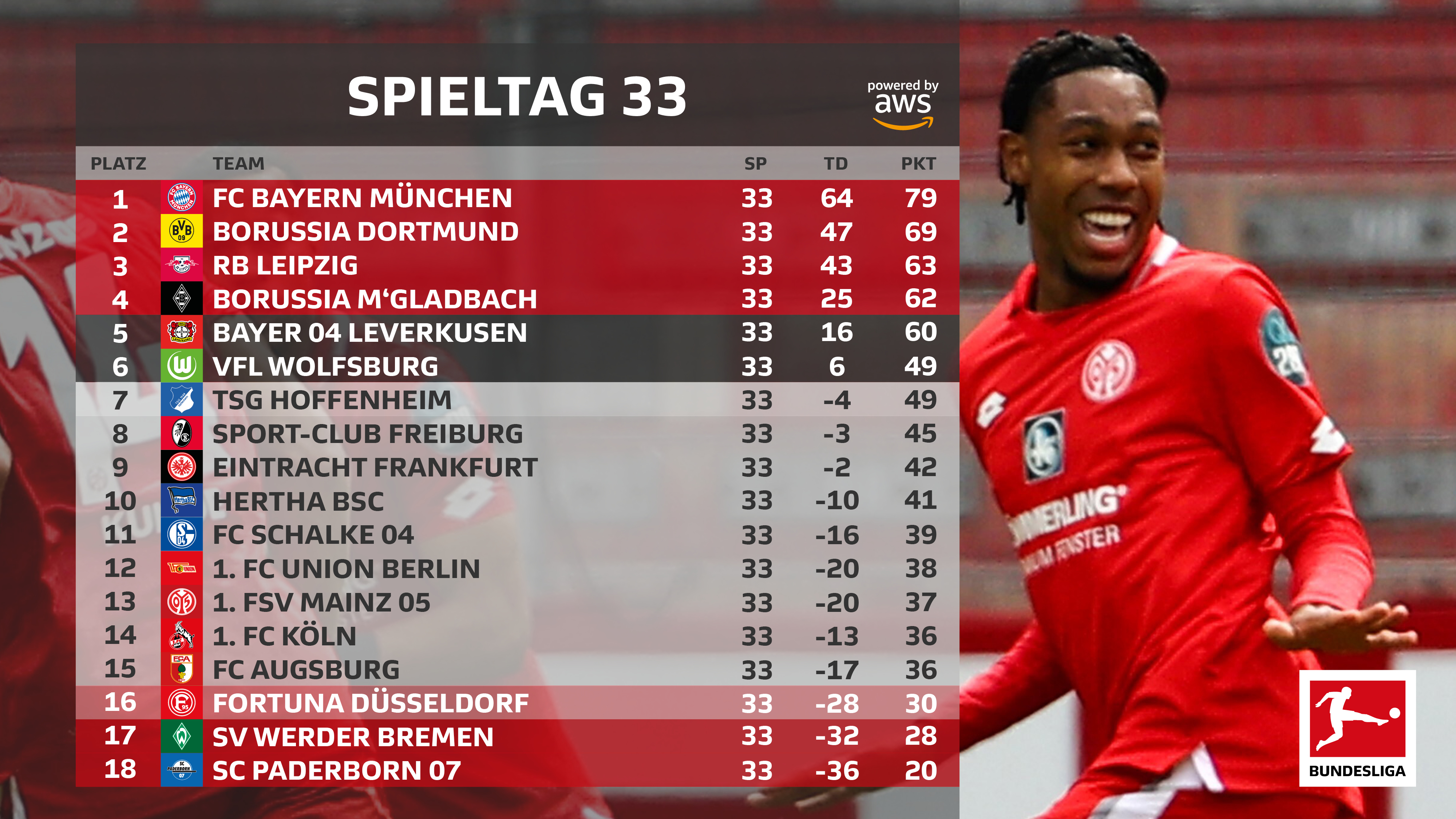 Alle Daten Anstoßzeiten und Ergebnisse für den 33. Spieltag Ergebnisse Spiele und Termine zum Spieltag Alle Tabellen Live-Ticker Statistiken. Augsburg 03 00 Dortmund 2 7 Leverkusen 22 20 Mgladbach 11 Der 33 Spieltag und die Tabelle der Bundesliga. Frankfurt 11 01 Mgladbach 10 1 Bayern 22 21 16 5 RB Leipzig 40 10 Augsburg 14 Der 33. Die Partie VfL Bochum - Bor. Durch die erste Linie sind die Champions-League-Plätze markiert durch. Alle Paarungen und Termine der Runde. Das Spiel Bochum gegen Mönchengladbach am 27..